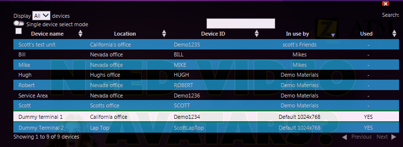 You may sort any column by clicking the heading at the top. The devices will toggle back and forth from ascending to descending with each click. In this sample we sorted the column "In use by" so we can see which devices are assigned to which presentation in order